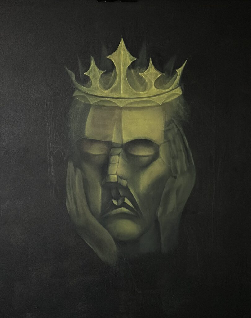 Das Gesicht, das in Nachdenklichkeit und Melancholie versunken ist, zeigt die Belastung, die mit diesen inneren Kämpfen einhergeht. Doch auch wenn es aussieht, als würde der Charakter von seinen Emotionen überwältigt, bleibt die Krone fest auf dem Kopf. Die Hand, die das Gesicht stützt, weist auf die Schwere dieser Auseinandersetzung hin, zugleich aber auch auf die Entschlossenheit, die eigenen Werte nicht aufzugeben.